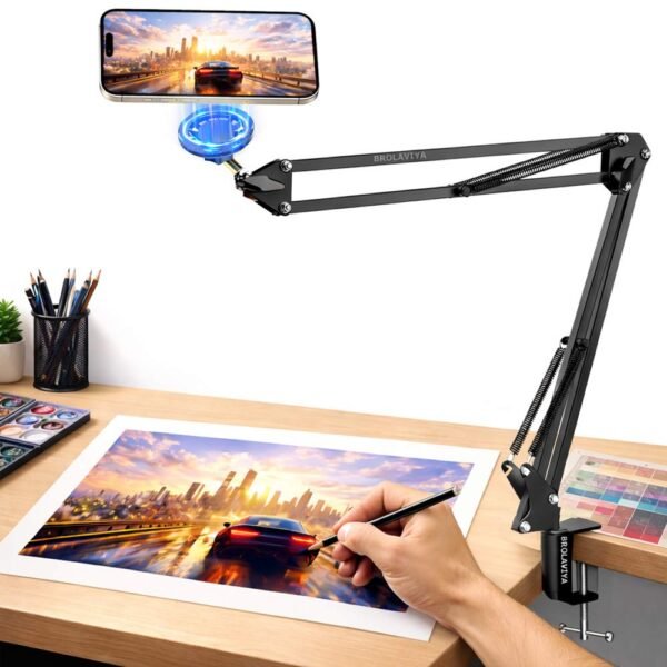 BROLAVIYA® Ovehead Magnetic Phone Holder with Adjustable Clamp Arm | Hands-Free Bed, Desk & Table Mount | 360° Rotation | Strong Magnet Compatible with iPhone and Smartphones for Home, Office