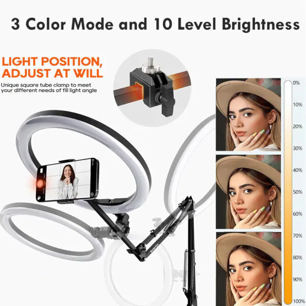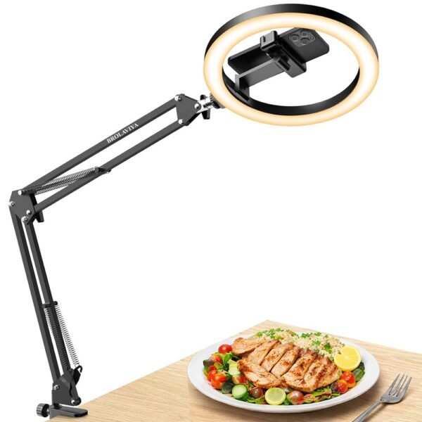 BROLAVIYA®No Shadow Overhead Video Mobile Stand with Extra Long Metal Arm,10inch Selfie Ring Light,2 Way Base clamp 1/4″ Adaptor for Camera, GoPro and Mobile Bracket for Desktop, Bedroom, Office