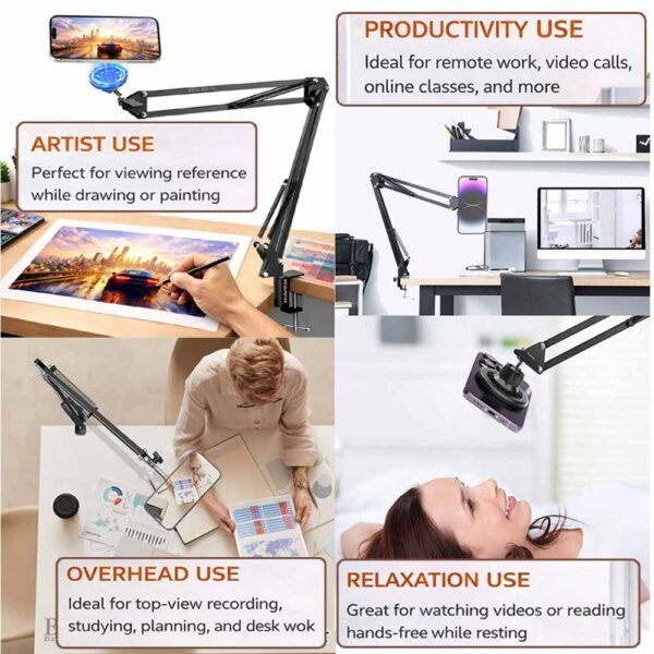 BROLAVIYA® Overhead Video Mobile Stand, New Extra Long Arm, 1/4″ Head 2 Way Base Clamp and Bracket for Mobile Phone For Overhead Video, Desktop, Bedroom, Office, Black