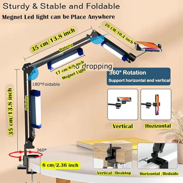 BROLAVIYA® Overhead Video Mobile Stand with 17cm Rechargeable LED Tube Light, New Extra-Long Arm, 1/4″ Head, 2 Way Clip Clamp and Mobile Bracket for Desktop, Bedroom, Office, Black