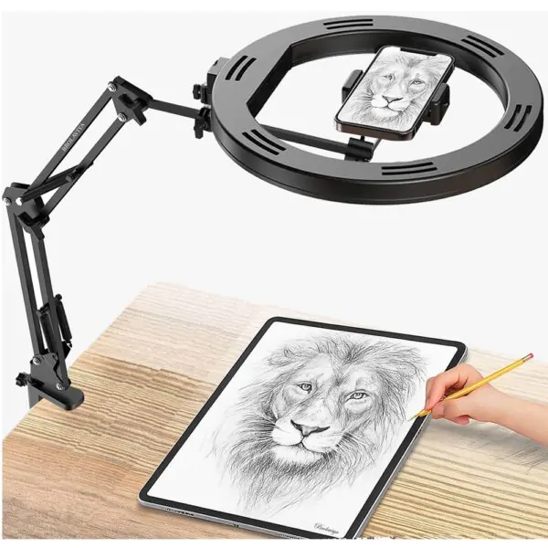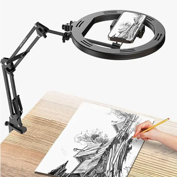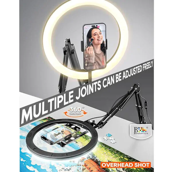 BROLAVIYA® Overhead Video Mobile Stand with 10 inch Ring Light, Metal Arm, 1/4″ Male Adaptor for Camera, Gopro, Mobile Bracket for Video, Desktop, Bedroom, Office