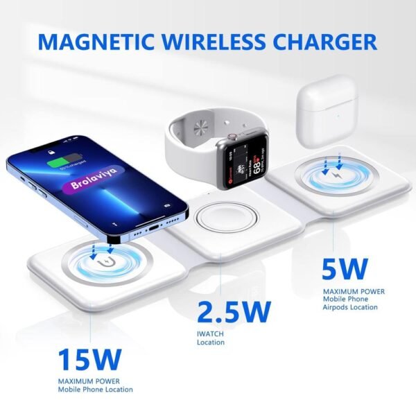 BROLAVIYA® 3 in 1 Magnetic Foldable 15w Wireless Charging Station for iPhone 17/16/15/13/12/11 Series, Samsung Galaxy S25/S24/S23/S22/S21/S20, with Type C Cable, White