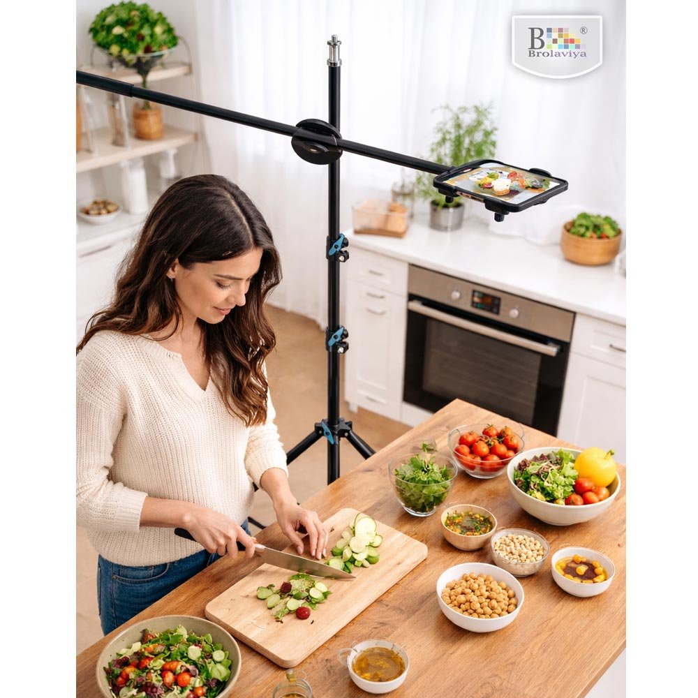 - Brolaviya tripod with middle telescopic crossbar arm stick for perfect overhead shot.