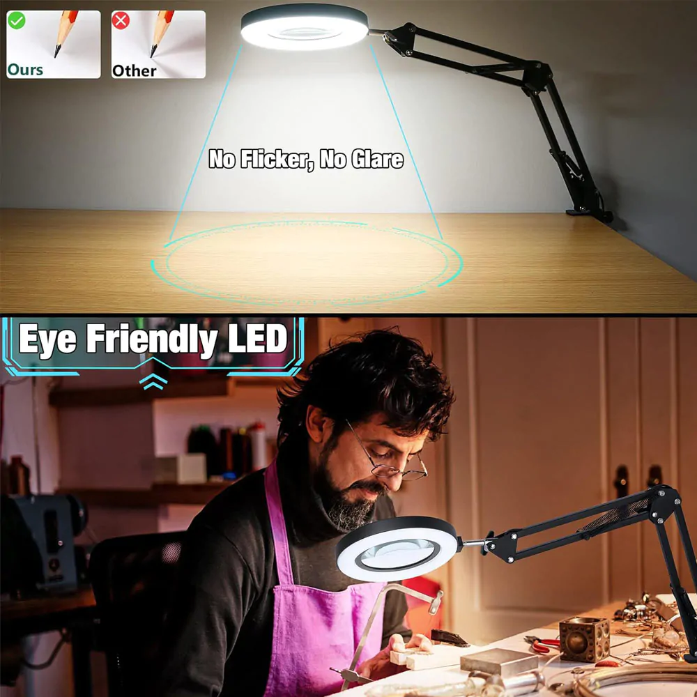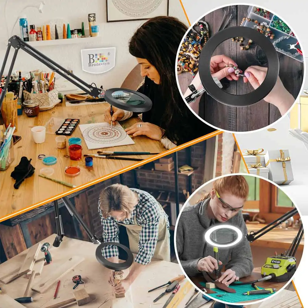 - 5X Magnification with 6 inch ring light : This lamp comes with a 4.3″ glass lens, magnification up to 5X, clear and without optical distortion. It is designed for people who need continuous close focus work or anyone who needs visual aids to reduce eye fatigue. It is very suitable for cross-stitching, sewing, painting, soldering etc..