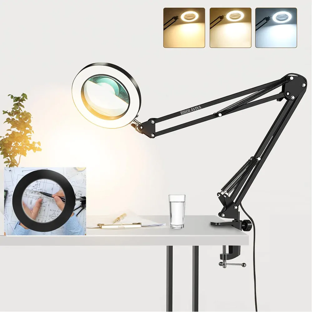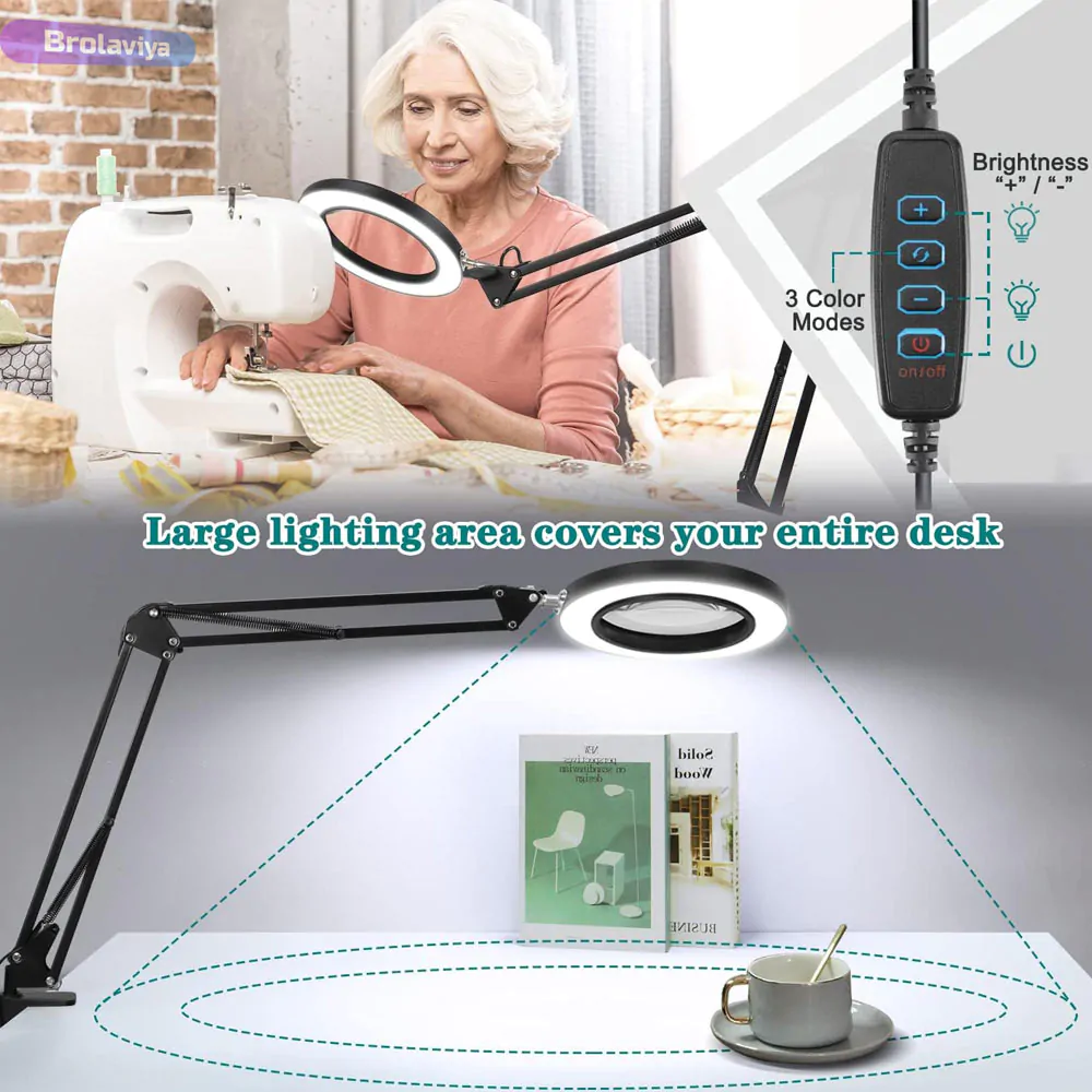 BROLAVIYA® 5X Magnifying Glass with LED Light and Stand, 3 Color Modes Dimmable, Adjustable Swivel Metal Arm, Large 2 Way Base Clamp, Magnifier Desk Lamp for Close Work, Repair, Crafts, Reading – Black