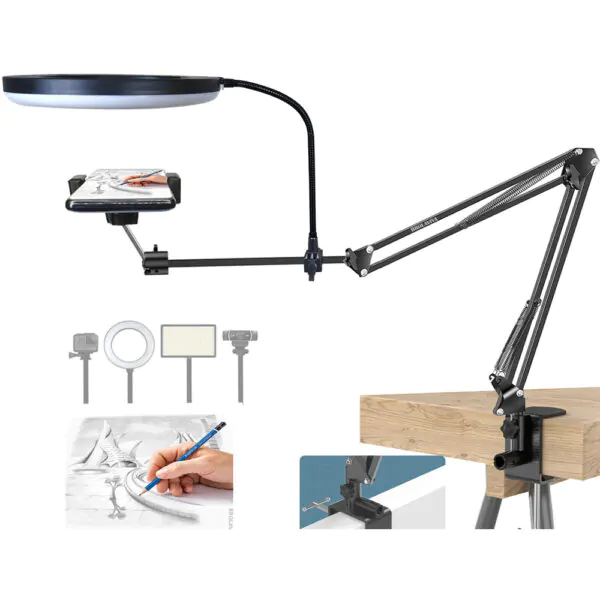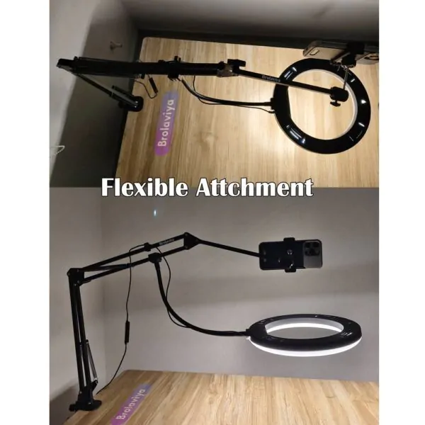 BROLAVIYA® No Shadow Overhead Video Mobile Stand, Extra Long Metal Arm, 10 inch Selfie Ring Light, Flexible Wire, 2-Way Base Clip, 1/4″ Head for Camera, GoPro, for Desktop, Bedroom, Office