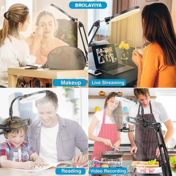 BROLAVIYA® Overhead 5X Magnifying Glass with LED Light and Stand, 3 Color Modes Dimmable, Flexible Hose Metal Arm, Magnifier Desk Lamp for Crafts, Makeup, Reading, Photography