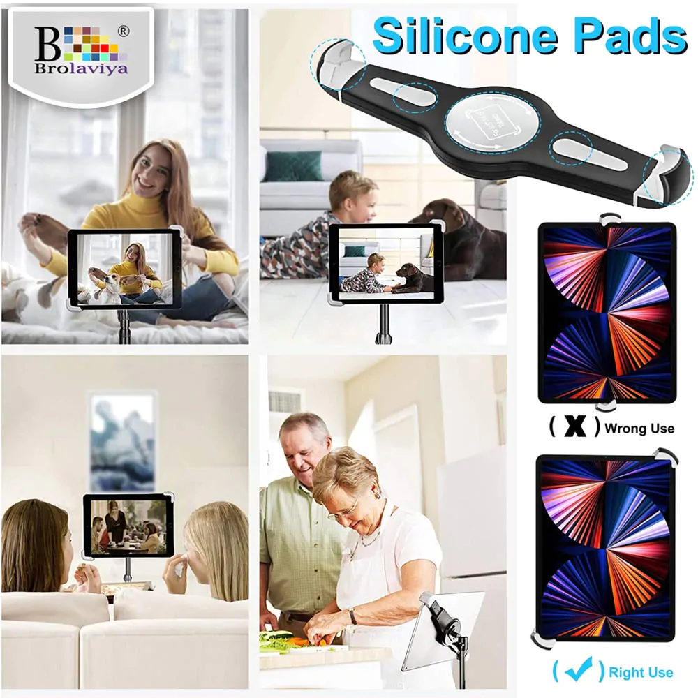 - New bracket extend from 10 inch to 15 inch, silicone pads increases friction to protect the tablet from scratches and securely hold your iPad while recording videos or photos.