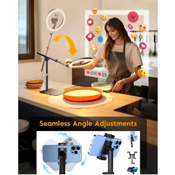 BROLAVIYA® Overhead Video Floor Stand with 10 Inch Ring Light, Metal Arm, 1/4″ Ball Head for Camera, Webcam, Gopro with Mobile Bracket for YouTube, Desktop, Bedroom, Office